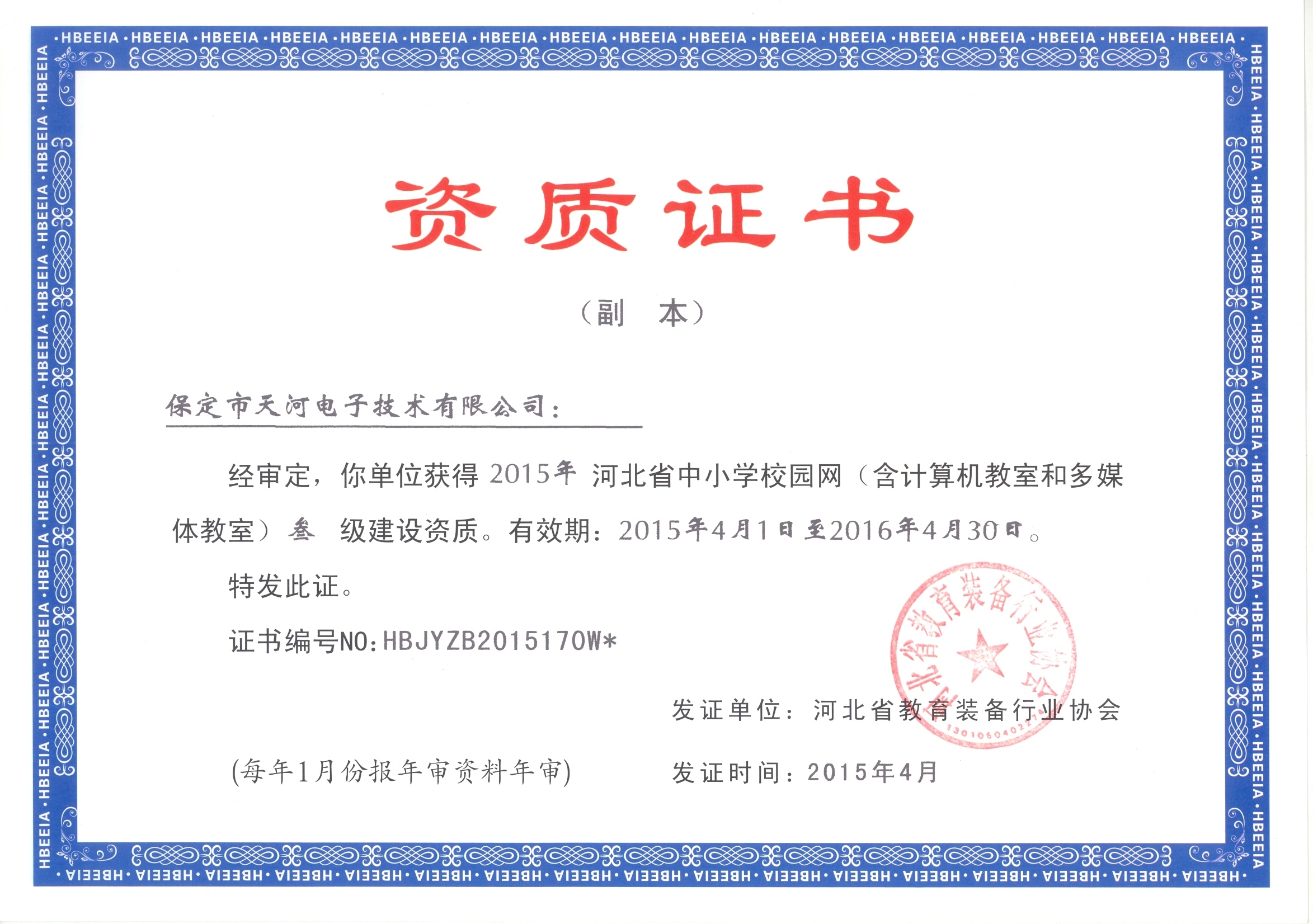 2015年4月我公司獲批河北省中小學(xué)校園網(wǎng)(含計算機教室和多媒體教室)叁級建設(shè)資質(zhì)