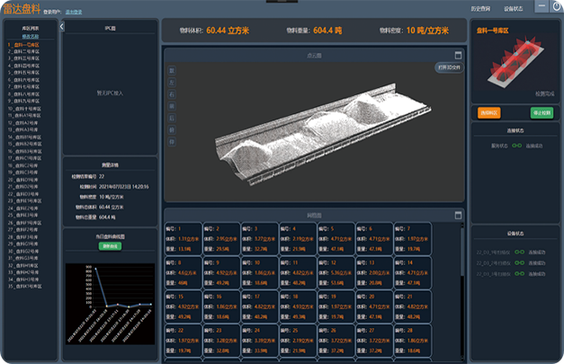 智能料倉盤庫系統(tǒng)主要由前端設(shè)備、傳輸通道及監(jiān)控中心三部分組成。前端設(shè)備主要由數(shù)據(jù)處理單元、激光檢測器等組成,激光檢測器接收系統(tǒng)指令對料堆進(jìn)行掃描,并將掃描數(shù)據(jù)上傳至數(shù)據(jù)處理主機(jī),數(shù)據(jù)處理主機(jī)對上傳的掃描數(shù)據(jù)進(jìn)行處理,最終生成料堆的三維模型,并將其獲得的三維模型數(shù)據(jù)上傳至監(jiān)控中心進(jìn)行處理、存儲。